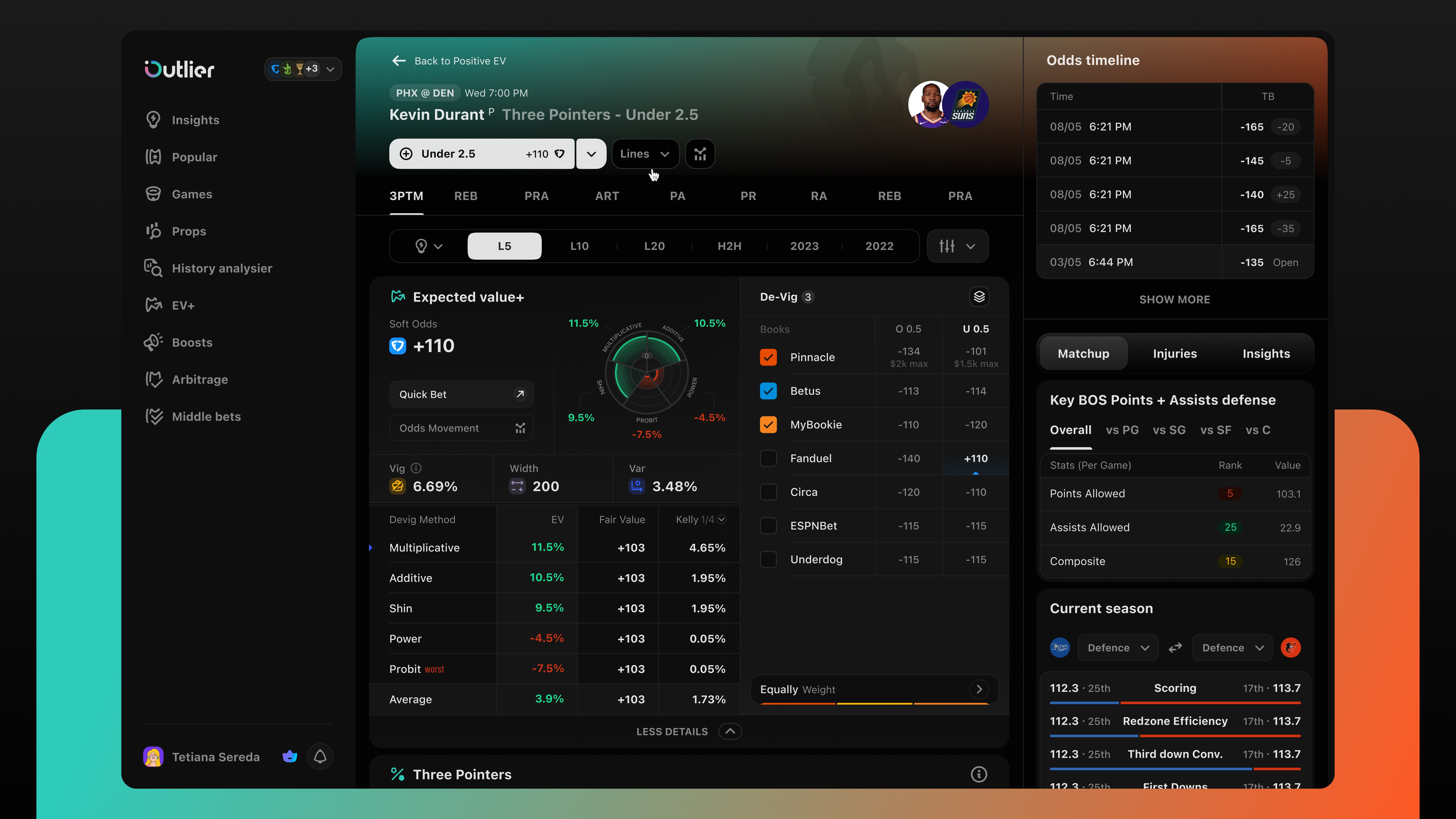 Sports betting web platform for player data analytics, line movement & odds
